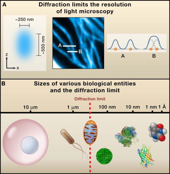 (B) Comparative size scale of biological structures relative to diffraction-limited resolution, including a mammalian cell, bacterial cell, mitochondrion, influenza virus, ribosome, green fluorescent protein, and small molecule (thymine).