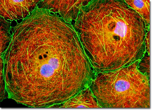 This dual- and triple-labeling approach allows detailed visualization of the cytoskeletal architecture in relation to nuclear organization, providing valuable insights into cellular morphology, spatial interactions between cytoskeletal components, and potential changes under experimental conditions.